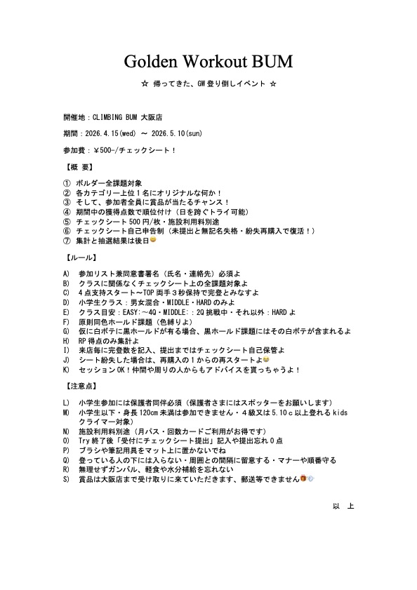 【大阪店】イベント情報「Golden Workout Bum」4/15〜5/10